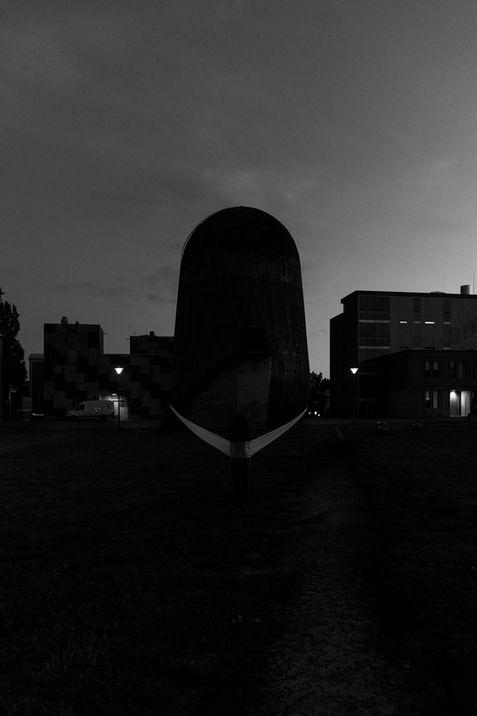 Während das Licht zwischen Sonnenuntergang und Abenddämmerung wechselt, stehe ich dem Turm von Angesicht zu Angesicht gegenüber, verbunden durch ein langes Tuch.